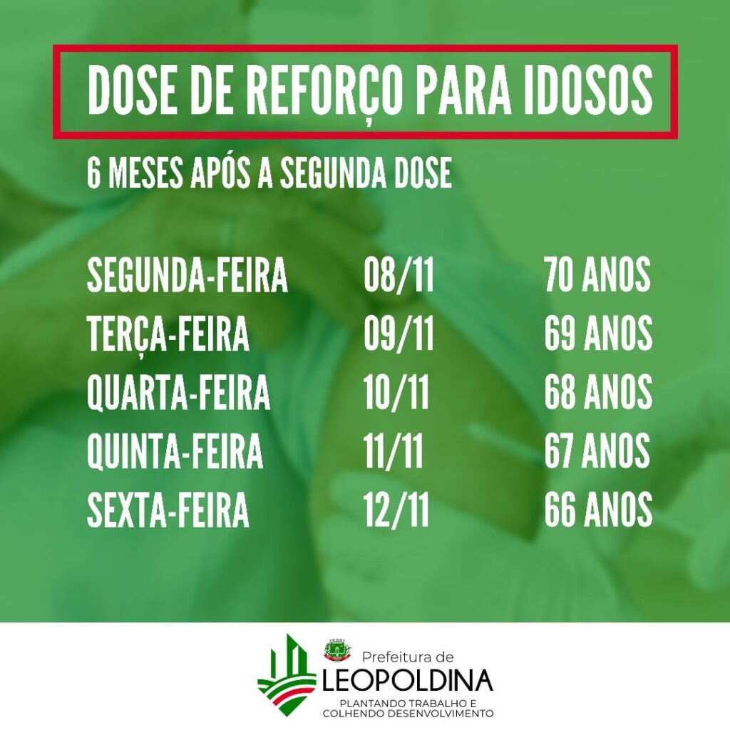 A Secretaria Municipal de Saúde de Leopoldina informou neste sábado, 6 de novembro, que vai imunizar com a dose de reforço idosos entre 66 e 70 anos.