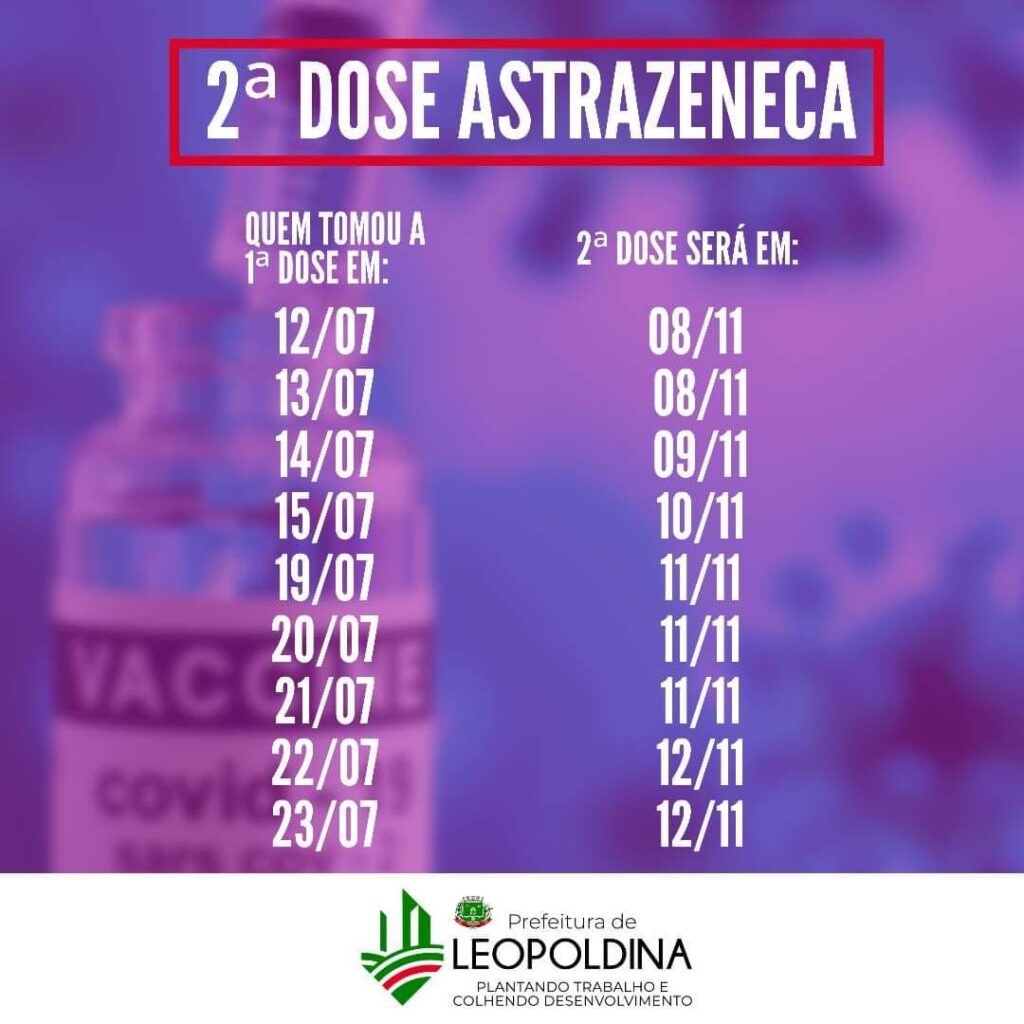 A prefeitura de Leopoldina divulgou o calendário de imunização contra a Covid-19 para a segunda dose da vacina AstraZeneca.