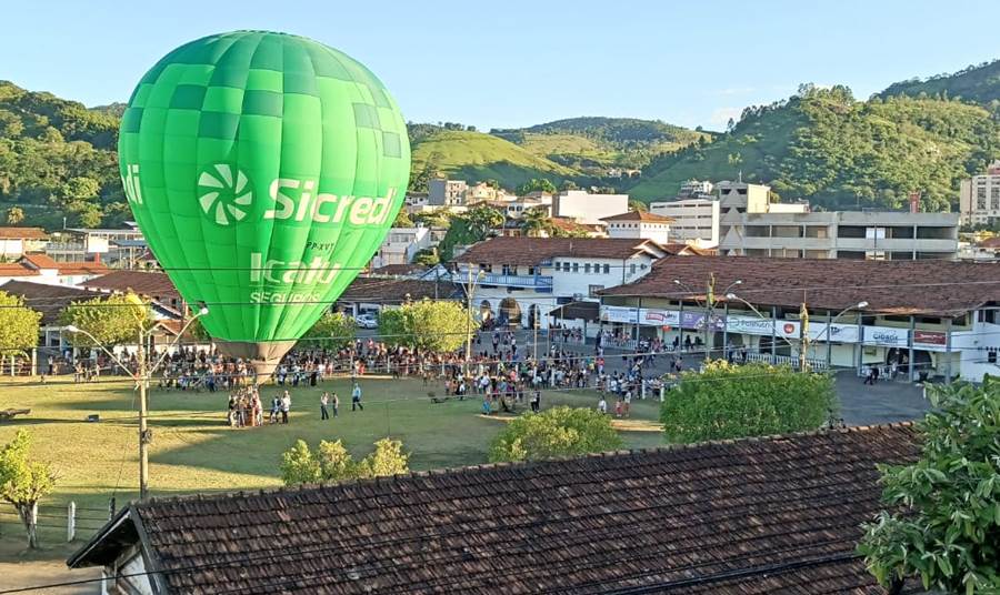 Um balão de ar quente do Sicredi Botucaraí RS/MG proporcionou um colorido diferente no céu de Leopoldina nesta quinta-feira, 9 de dezembro.