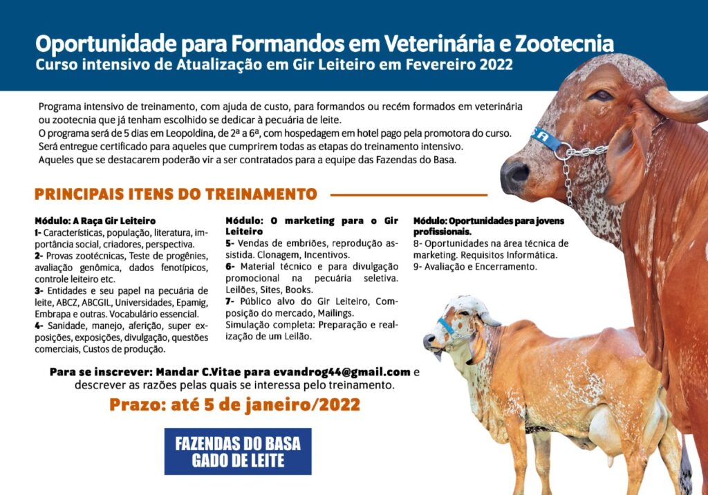 As Fazendas do Basa promovem em Leopoldina um programa intensivo de treinamento, com ajuda de custo, para formandos ou recém formados em veterinária ou zootecnia que já tenham escolhido se dedicar à pecuária de leite.