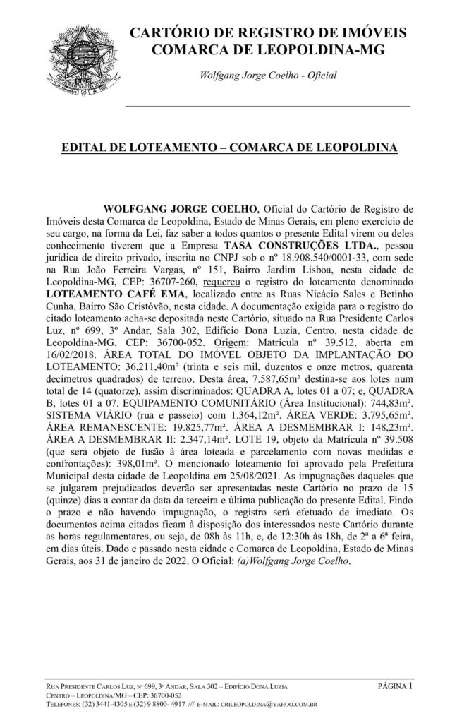WOLFGANG JORGE COELHO, Oficial do Cartório de Registro de Imóveis desta Comarca de Leopoldina, Estado de Minas Gerais, em pleno exercício de seu cargo, na forma da Lei, faz saber a todos quantos o presente Edital virem ou deles conhecimento tiverem que a Empresa TASA CONSTRUÇÕES LTDA., pessoa jurídica de direito privado, inscrita no CNPJ sob o nº 18.908.540/0001-33, com sede na Rua João Ferreira Vargas, nº 151, Bairro Jardim Lisboa, nesta cidade de Leopoldina-MG, CEP: 36707-260, requereu o registro do loteamento denominado LOTEAMENTO CAFÉ EMA, localizado entre as Ruas Nicácio Sales e Betinho Cunha, Bairro São Cristóvão, nesta cidade. A documentação exigida para o registro do citado loteamento acha-se depositada neste Cartório, situado na Rua Presidente Carlos Luz, nº 699, 3º Andar, Sala 302, Edifício Dona Luzia, Centro, nesta cidade de Leopoldina-MG, CEP: 36700-052. Origem: Matrícula nº 39.512, aberta em 16/02/2018. ÁREA TOTAL DO IMÓVEL OBJETO DA IMPLANTAÇÃO DO LOTEAMENTO: 36.211,40m² (trinta e seis mil, duzentos e onze metros, quarenta decímetros quadrados) de terreno. Desta área, 7.587,65m² destina-se aos lotes num total de 14 (quatorze), assim discriminados: QUADRA A, lotes 01 a 07; e, QUADRA B, lotes 01 a 07. EQUIPAMENTO COMUNITÁRIO (Área Institucional): 744,83m². SISTEMA VIÁRIO (rua e passeio) com 1.364,12m². ÁREA VERDE: 3.795,65m². ÁREA REMANESCENTE: 19.825,77m². ÁREA A DESMEMBRAR I: 148,23m². ÁREA A DESMEMBRAR II: 2.347,14m². LOTE 19, objeto da Matrícula nº 39.508 (que será objeto de fusão à área loteada e parcelamento com novas medidas e confrontações): 398,01m². O mencionado loteamento foi aprovado pela Prefeitura Municipal desta cidade de Leopoldina em 25/08/2021. As impugnações daqueles que se julgarem prejudicados deverão ser apresentadas neste Cartório no prazo de 15 (quinze) dias a contar da data da terceira e última publicação do presente Edital. Findo o prazo e não havendo impugnação, o registro será efetuado de imediato. Os documentos acima citados ficam à disposição dos interessados neste Cartório durante as horas regulamentares, ou seja, de 08h às 11h, e, de 12:30h às 18h, de 2ª a 6ª feira, em dias úteis. Dado e passado nesta cidade e Comarca de Leopoldina, Estado de Minas Gerais, aos 31 de janeiro de 2022. O Oficial: (a)Wolfgang Jorge Coelho.