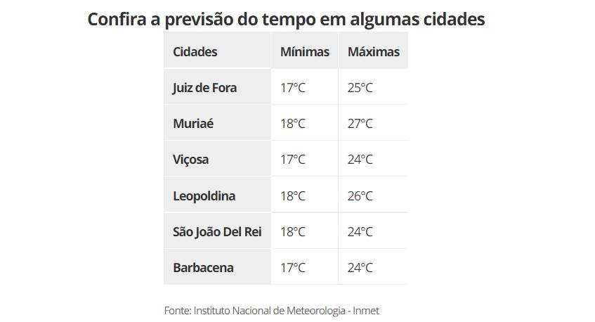 Dentre as cidades das regiões, Barbacena, Viçosa e Juiz de Fora podem registrar a menor média nas temperaturas neste fim de semana com 17°C. Já em relação às médias máximas, estas devem ser registradas em Muriaé com 28°C.