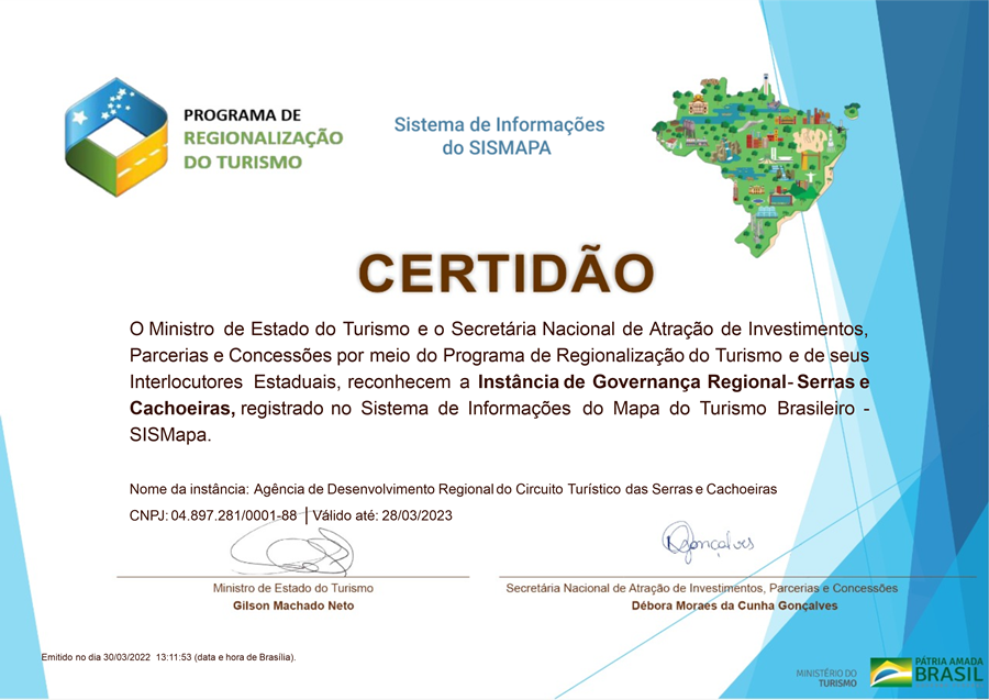 Junto com o município e a IGR é certificado também o COMTUR – Conselho Municipal de Turismo, órgão responsável pela gestão do FUMTUR – Fundo Municipal de Turismo. O Mapa do Turismo Brasileiro 2022-2023 foi regulamentado pela Portaria MTUR Nº 4, de 21 de janeiro de 2022.