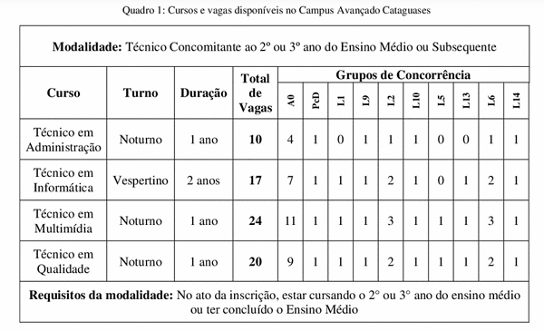 O IF Sudeste lançou edital para a realização de processo seletivo para o preenchimento de vagas ociosas em quatro cursos técnicos gratuitos que estão sendo oferecidos no Campus Avançado de Cataguases. No total, estão disponíveis 71 vagas distribuídas entre os cursos técnicos de Administração, Informática, Multimídia e de Qualidade.