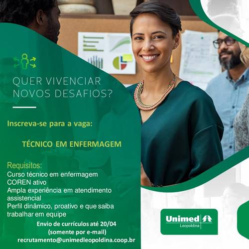 Os currículos podem ser enviados até o dia 20 de abril de 2022, somente por e-mail: recrutamento@unimedleopoldina.coop.br