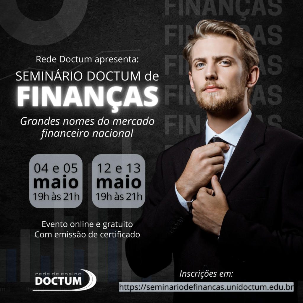 As inscrições estão abertas e poderão ser efetuadas através do link: https://conteudo.unidoctum.edu.br/seminario-doctum-financas
