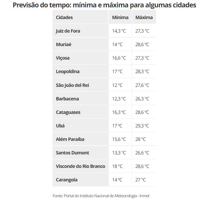 A previsão do tempo para o fim de semana na Zona da Mata e Campo das Vertentes será de céu nublado e possibilidade de chuva em algumas cidades. As temperaturas variam entre 14 ºC e 28 ºC nas regiões. A informação é do Instituto Nacional de Meteorologia (Inmet).