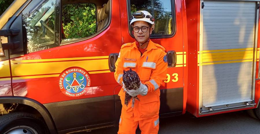 Com o apoio de uma plataforma elevatória da Escola Preparatória de Cadetes do Ar (Epcar) e uma rede, os militares conseguiram cortar a linha e resgatar a coruja que se encontrava em situação de risco.