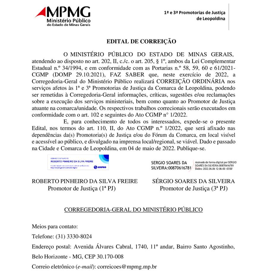 A Corregedoria-Geral do Ministério Público de Minas Gerais divulgou o edital de designação de Correição Ordinária que será realizada nos serviços da 1ª e 3ª Promotorias de Justiça da Comarca de Leopoldina.