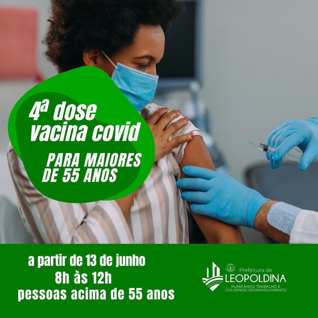 A Prefeitura de Leopoldina, por meio da Secretaria Municipal de Saúde, começa a aplicar a partir desta segunda-feira, 13 de junho, a aplicação da 4ª dose de vacina contra a Covid-19 para maiores de 55 anos.