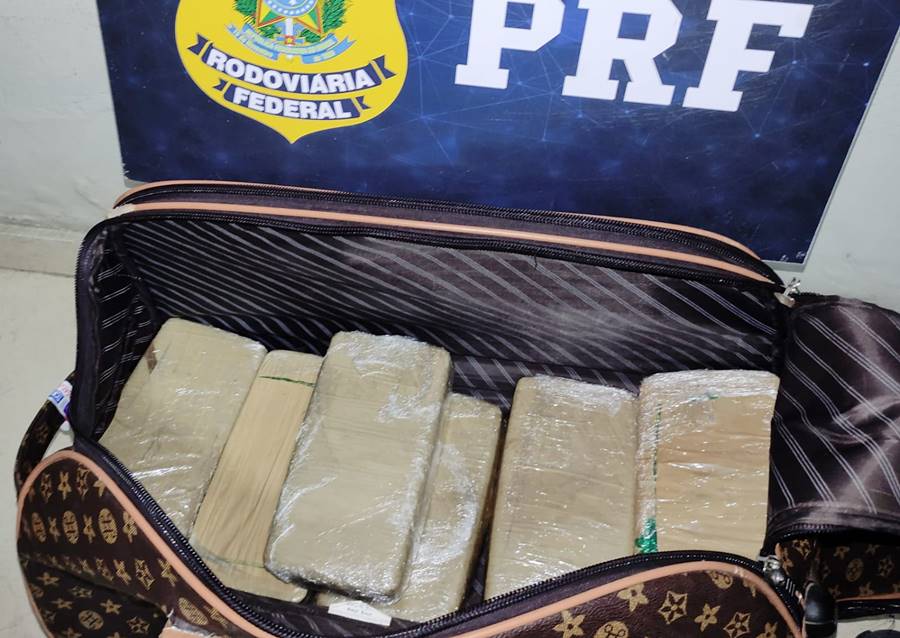 Em revista à bagagem da passageira, os policiais localizaram e apreenderam seis quilos de pasta base de cocaína e realizaram a prisão em flagrante.