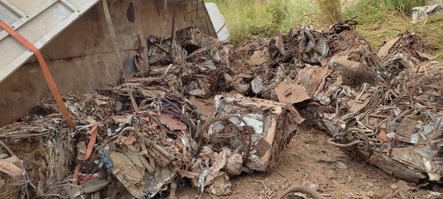 Com o impacto, a carga de sucatas ficou espalhada no acostamento e o motorista conseguiu sair do veículo sem ferimentos.