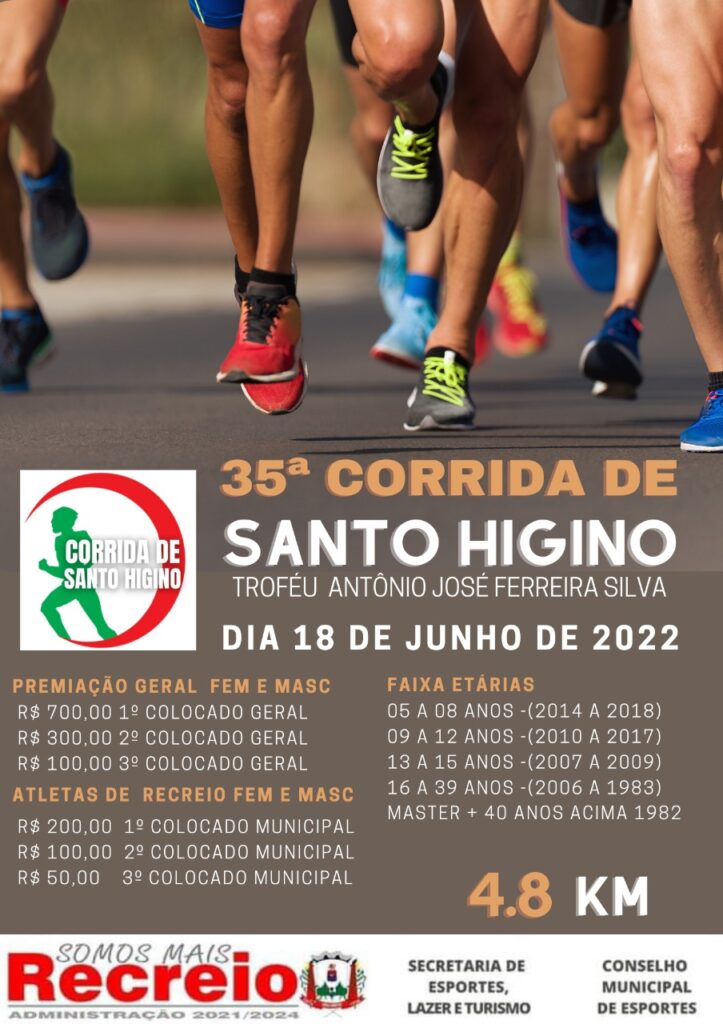 Um dos eventos esportivos mais tradicionais da região, a Corrida de Santo Higino de Recreio, está de volta neste sábado (18), a partir das 13h. O evento conta com premiações de quase R$ 3 mil para dividir entre os campeões do trajeto Conceição-Recreio, brindes para os vencedores do trajeto cidade e medalhas para todos os participantes. O troféu da 35ª edição será em homenagem a Antônio José Ferreira Silva “Papel”.