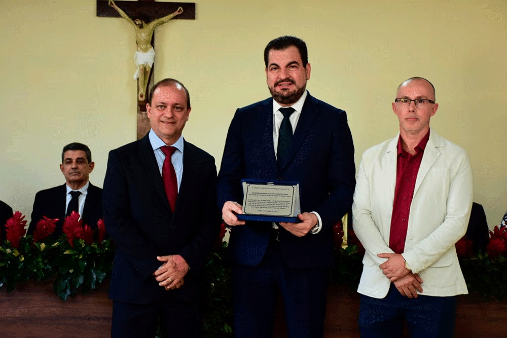 Presidente Gilson Lemes, entre o juiz Antônio Augusto Pavel Toledo e o gerente de secretaria Sanderson Nogueira, recebeu homenagem dos servidores da comarca durante a solenidade, na qual também foi prestigiado com o título de Cidadão Honorário de Palma – Crédito: Mirna de Moura/TJMG