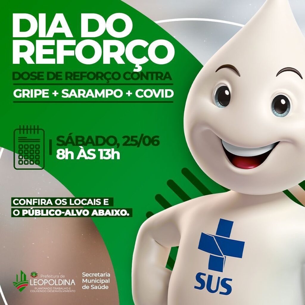 A Secretaria Municipal de Saúde de Leopoldina realiza no próximo sábado, 25 de junho, o Dia do Reforço contra a gripe, sarampo e covid. A ação ocorre de 8h00 às 13h00.