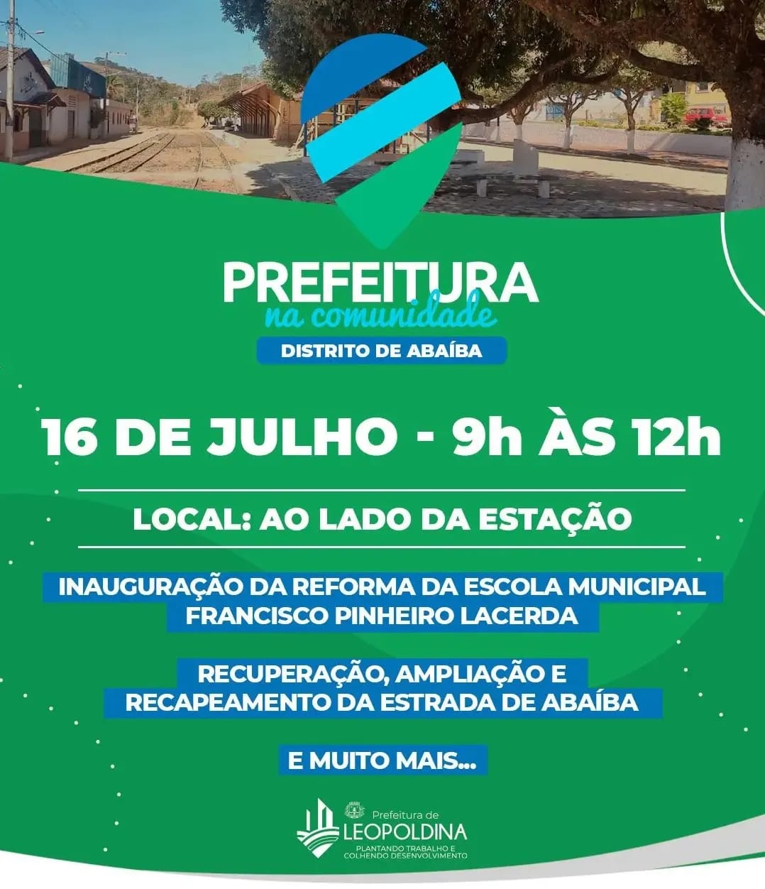 Moradores do distrito de Abaíba serão beneficiados com a ação social “Prefeitura na Comunidade”, que acontece neste sábado, dia 16 de julho, das 9h00 às 12h00, ao lado da Estação, e vai levar diversos serviços e atividades para as comunidades.