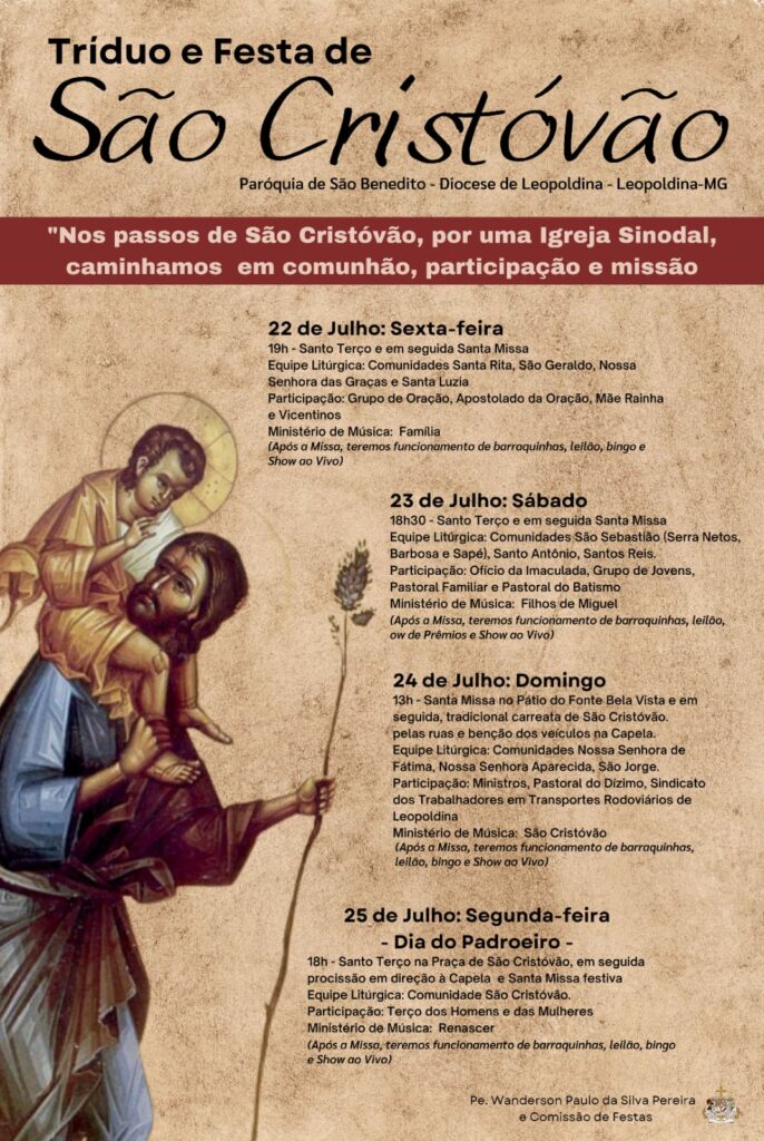 Com o tema “Nos passos de São Cristóvão, por uma Igreja Sinodal, caminhamos em comunhão, participação e missão”, a comunidade do São Cristóvão e o Sindicato dos Trabalhadores Autônomos de Veículos Rodoviários de Leopoldina contam com a presença da população durante os dias de festejo.