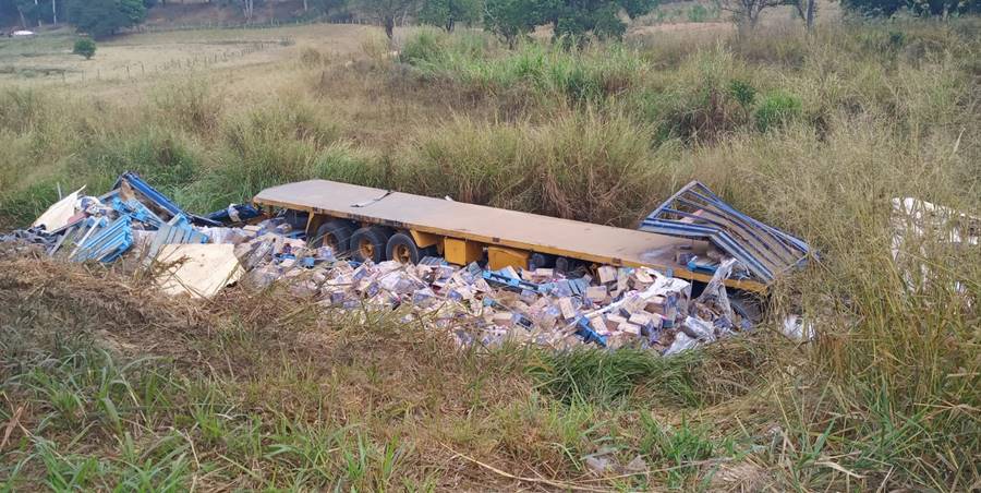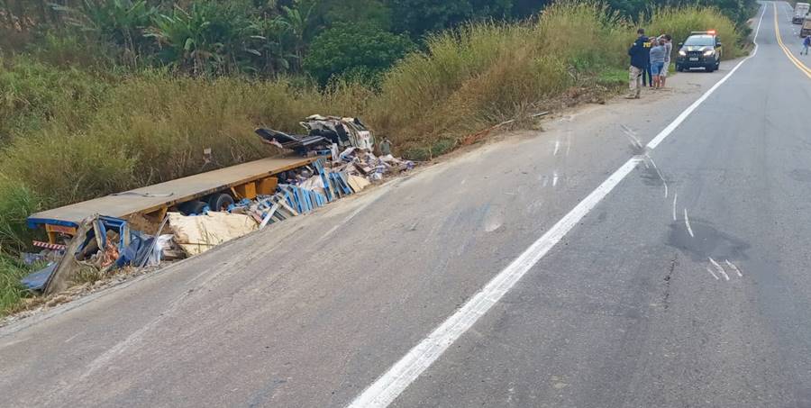 O motorista de uma carreta ficou ferido em um acidente na manhã deste sábado, 23 de julho, na rodovia BR-116 em Leopoldina. O veículo seguia sentido Serra, no Espírito Santo, carregado com amaciantes quando saiu da pista e tombou na altura do km 777.