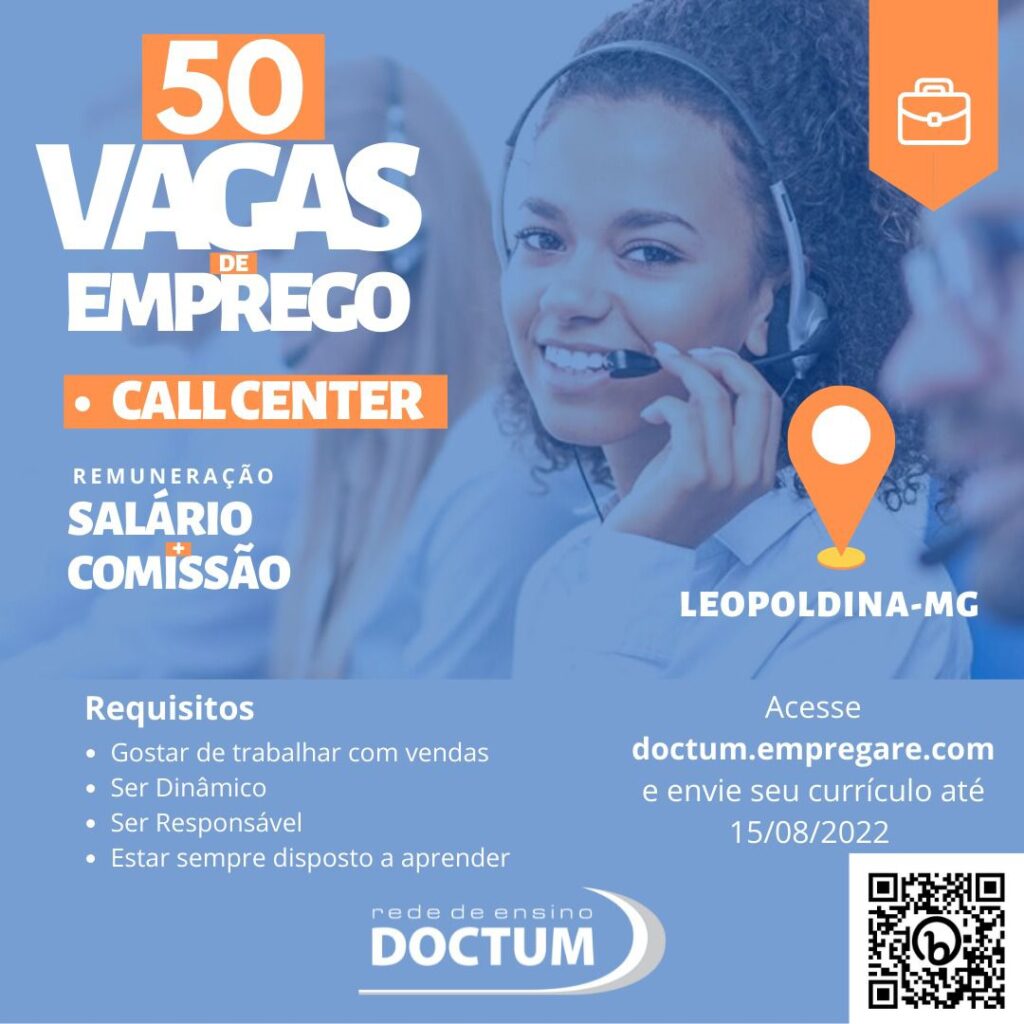 A Rede de Ensino Doctum divulgou a abertura de 50 vagas para Operador de Telemarketing em Leopoldina.