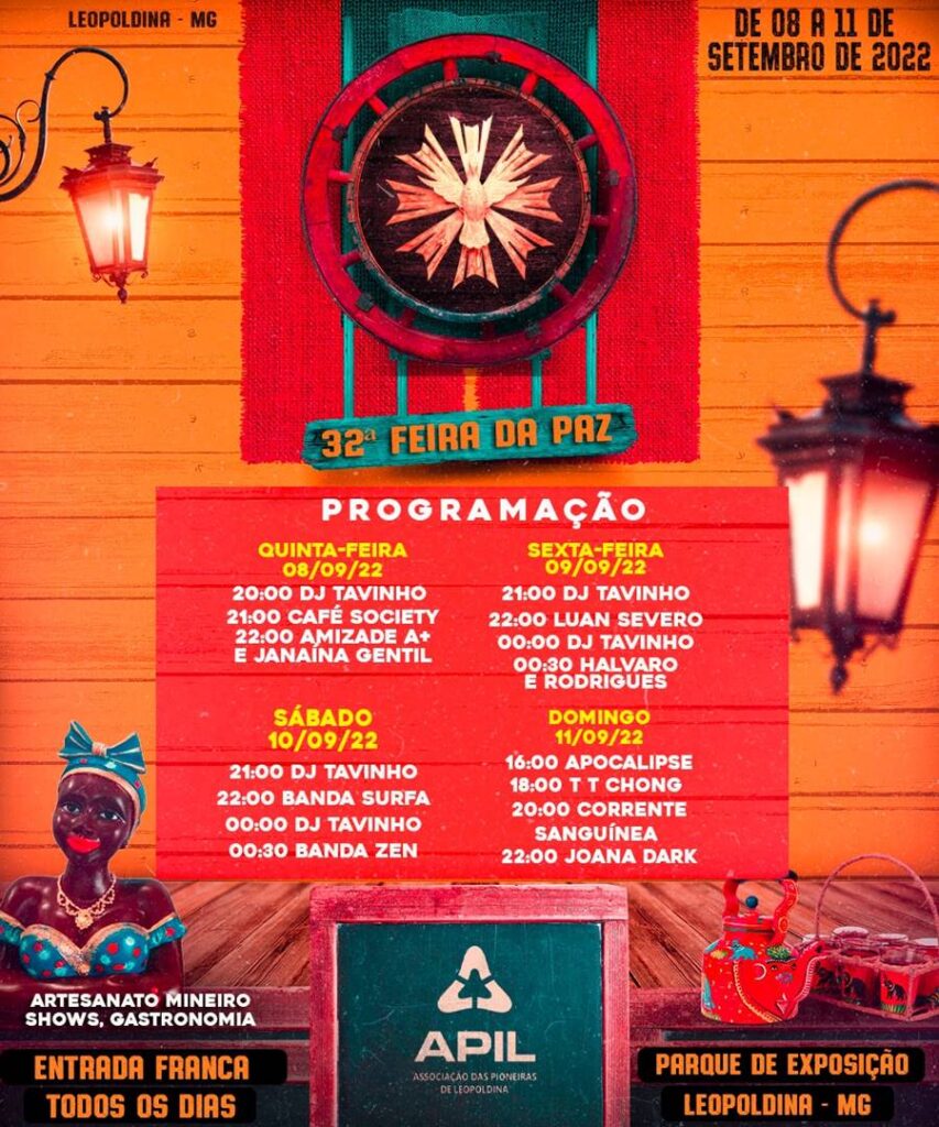 De 8 a 11 de Setembro será realizada em Leopoldina a 32ª Feira da Paz, uma das mais tradicionais festas populares do município, promovida pela Associação das Pioneiras de Leopoldina (APIL).