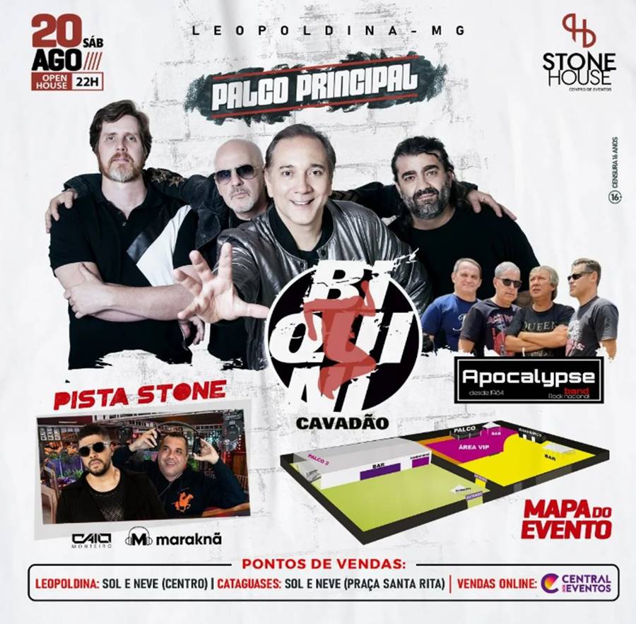 A banda Biquíni Cavadão se apresenta neste sábado, 20 de agosto, na Stone House em Leopoldina. O evento terá dois ambientes simultâneos e também reúne atrações como a Banda Apocalypse, DJ Maraknã e Dj Caio Monteiro.