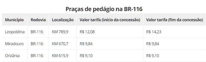 Pela modelagem proposta pelo Ministério da Infraestrutura, está prevista uma redução progressiva nas tarifas de pedágio de toda a extensão do sistema rodoviário. No total, serão 12 praças de pedágio, sendo 7 em Minas Gerais.