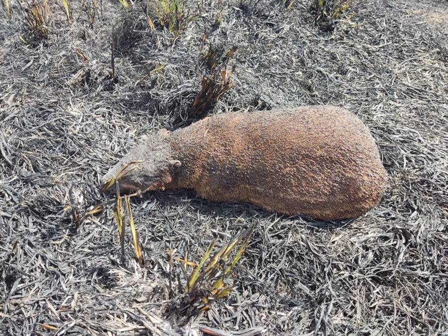 Ainda segundo os Bombeiros, vários animais feridos foram vistos no local, dentre eles, lagartos que corriam no meio das chamas. Uma paca (foto) foi queimada e não resistiu.