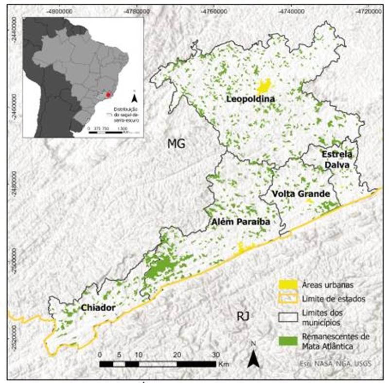 Mapa representando os municípios onde o sagui-da-serra-escuro foi encontrado, sua respectiva cobertura florestal, e no detalhe, a distribuição conhecida da espécie. Fonte: Felipe Pacheco.