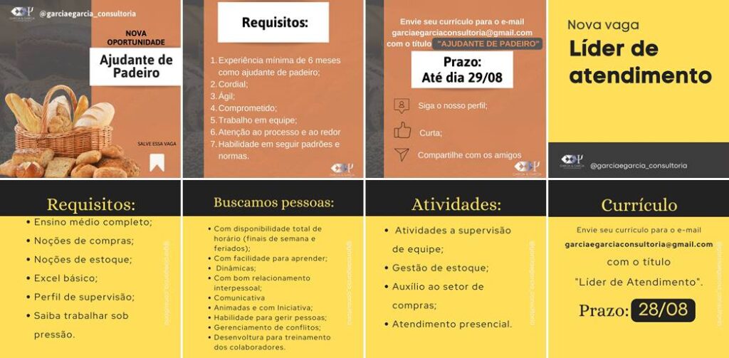 Garcia & Garcia Consultoria, empresa sediada em Leopoldina, divulga duas oportunidades de trabalho: “Ajudante de Padeiro” e “Líder de Atendimento”.