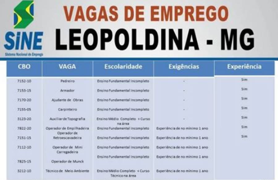 Conforme o Sine, as vagas disponíveis são oferecidas pelo Grupo Zopone Engenharia e pelo SINE e os interessados devem se inscrever através da plataforma EMPREGABRASIL, pelo aplicativo SINE Fácil ou no Posto de Atendimento UAI localizado na Rua Barão de Cotegipe, nº 10, no Centro de Leopoldina. O horário de funcionamento é de 8h00 às 17h00.