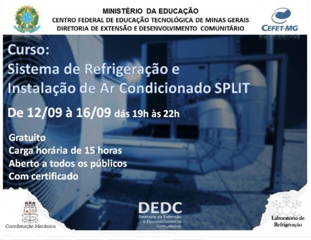 Cumprindo sua missão de integração com a comunidade externa, o CEFET-MG, campus Leopoldina oferta entre os dias 12 e 16 de setembro, um curso de extensão, organizado pela Coordenação de Mecânica, intitulado Sistema de Refrigeração e Instalação de Ar-Condicionado SPLIT.