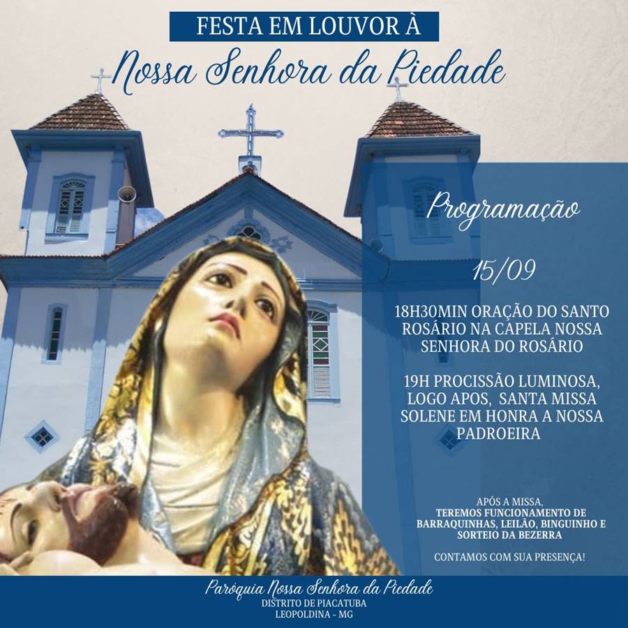 Será realizada no distrito leopoldinense de Piacatuba nesta nesta quinta-feira, dia 15 de setembro, a Festa em louvor à Nossa Senhora da Piedade.