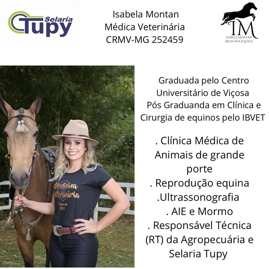 Dra. Isabela de Castro Montan é Médica Veterinária (CRMV-MG 25459) e Pós Graduanda em Clínica e Cirurgia de Equinos.