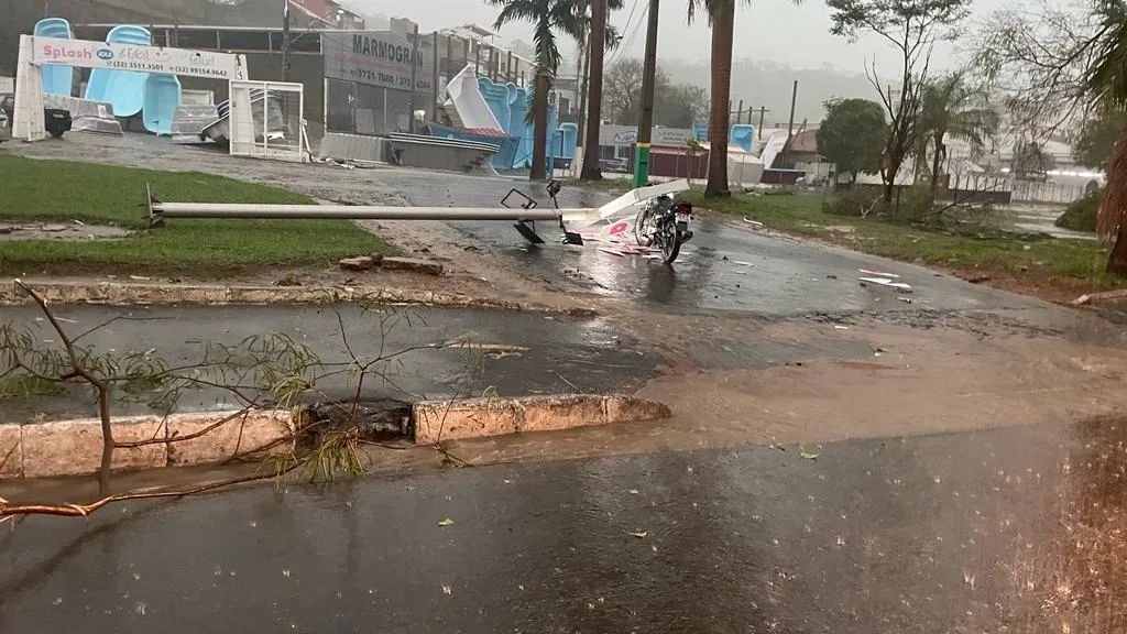 Cenas impressionantes foram registradas na tarde desta terça-feira (4), em Muriaé, na Zona da Mata mineira. Devido às rajadas de vento, a estrutura da cobertura de um posto de combustíveis, na entrada do Bairro Patrimônio São José, ficou tombada. Por sorte, nenhum veículo estava por baixo de onde a estrutura cedeu.