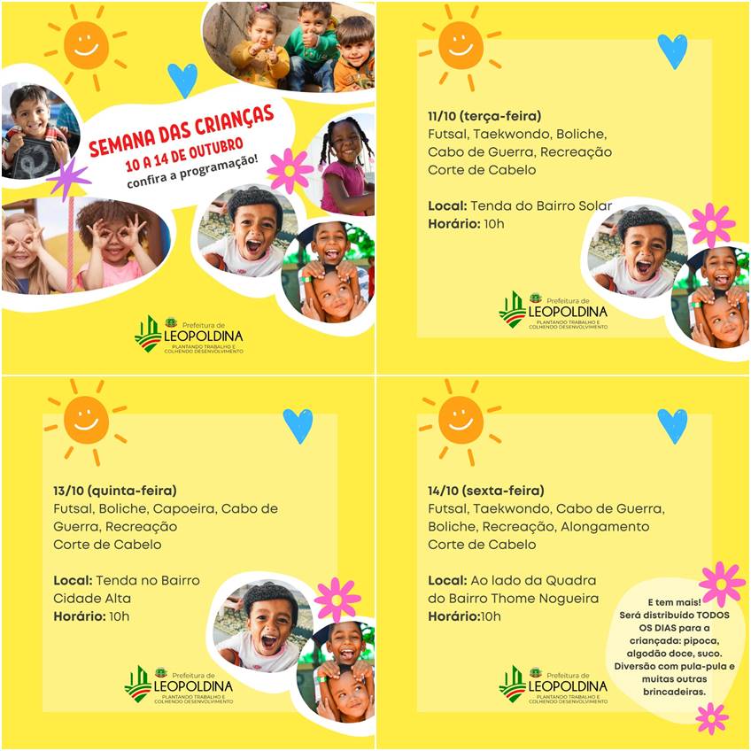 A Prefeitura de Leopoldina, por meio da Secretaria Municipal de Assistência Social, realiza a partir desta segunda-feira, 10 de outubro, até sexta-feira, dia 14, uma série de ações em comemoração a Semana da Criança.