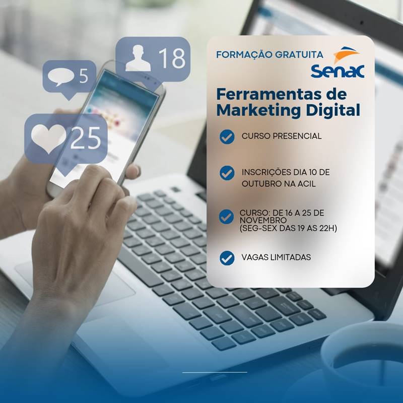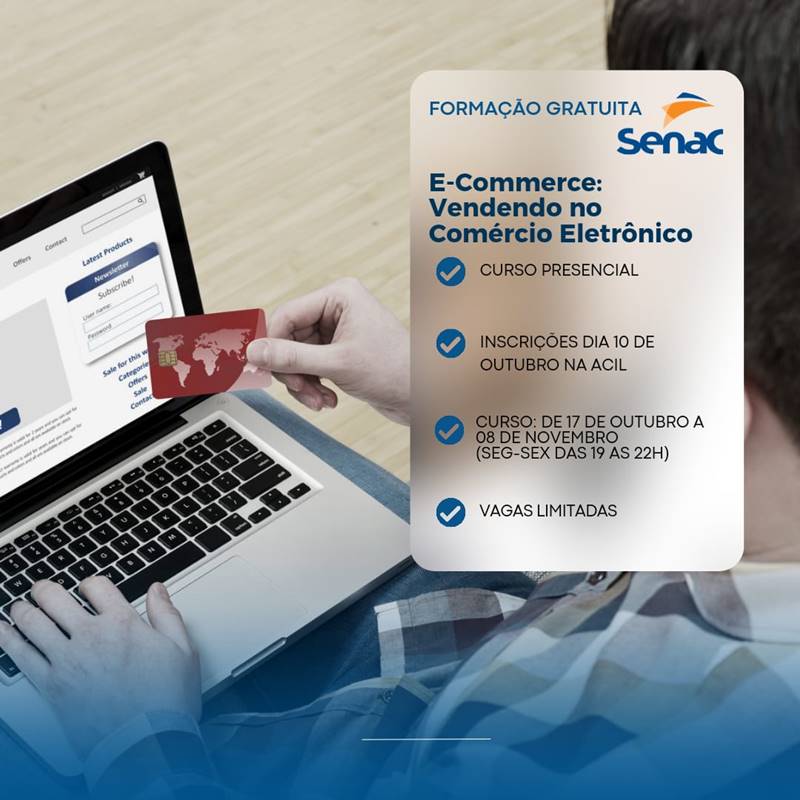A Associação Comercial, Industrial, Agropecuária e Serviços de Leopoldina (ACIL), disponibiliza dois cursos presenciais de formação gratuita, em parceria com o Senac: “E-commerce: Vendendo no Comércio Eletrônico” e “Ferramentas de Marketing Digital”.