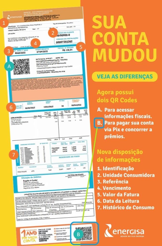 Todos os outros dados da conta, como histórico de consumo continuam na conta, logo abaixo dos dados fiscais. Mas é na parte final da fatura é que estão o QR Code para pagamento via PIX ou o código de barras. Ou seja, no QR Code de cima você conhece os dados fiscais da conta. O que fica lá embaixo é para pagamento com PIX da Energisa, onde o cliente ainda pode concorrer a “Um ano de conta grátis”. Para saber mais sobre a nova conta, o consumidor pode buscar as agências ou um dos nossos canais. Todos estes meios foram reforçados para apoiar o consumidor.