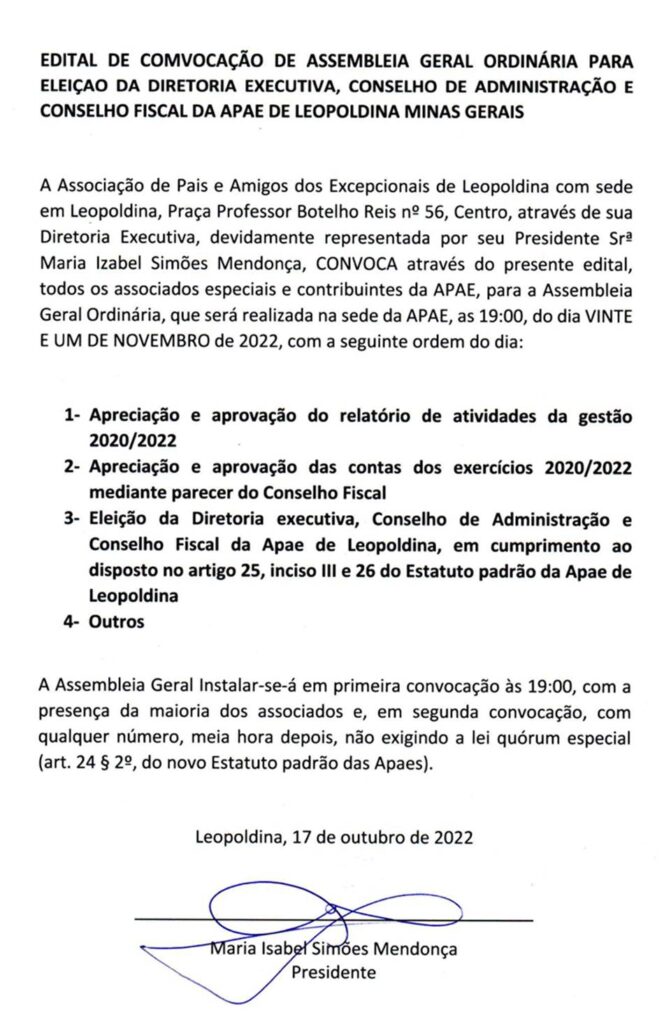 Apae Leopoldina convoca reunião para Assembleia Geral Ordinária