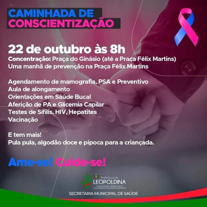 Com o objetivo de chamar a atenção para a prevenção de duas das doenças que mais matam no mundo: o câncer de mama e de próstata, a Prefeitura de Leopoldina, por meio da Secretaria de Saúde, convida toda a população para participar da Caminhada da Conscientização, que acontecerá neste sábado, dia 22, às 8h00, com concentração na Praça do Ginásio até a Praça Félix Martins.