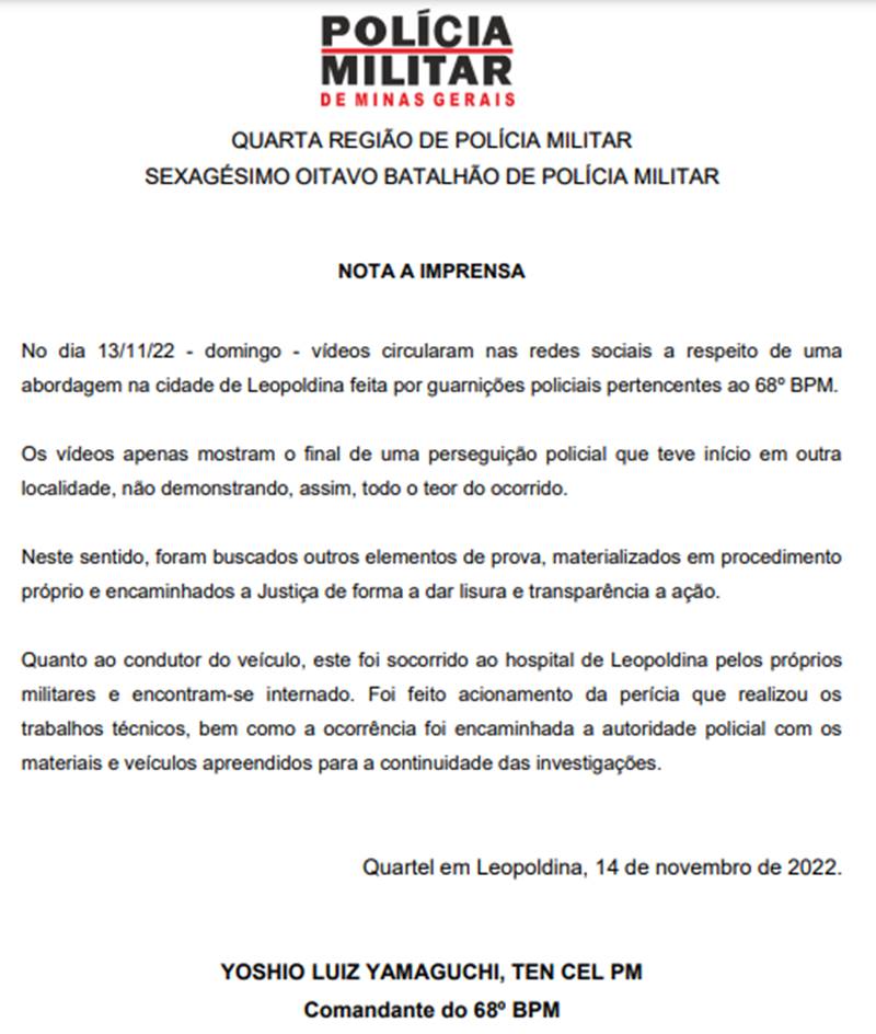 A Polícia Militar divulgou Nota à Imprensa na manhã desta segunda-feira, dia 14 de novembro, esclarecendo sobre a abordagem policial feita ao final de uma perseguição ocorrida em Leopoldina na tarde deste domingo. A Nota é assinada pelo Comandante do 68º Batalhão de Polícia, Tenente Coronel Yoshio Luiz Yamaguchi. Confira a íntegra do documento: