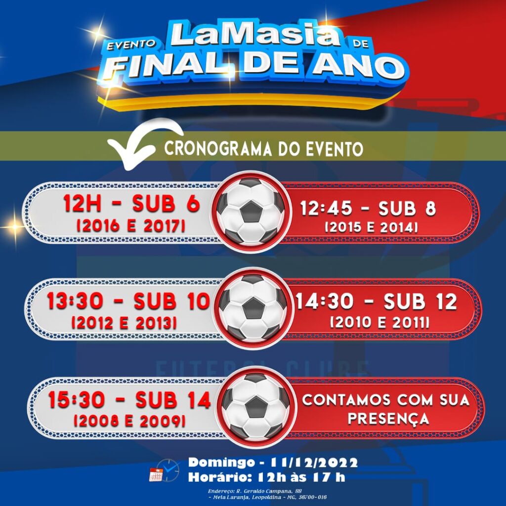 No domingo, dia 11 de dezembro, de 12h00 as 17h00, La Masia promove um evento de final de ano com a seguinte programação: 12h00 – Sub 6 (2016 e 2017), 12h45 – Sub 8 (2015 e 2014), 13h30 – Sub 10 (2012 e 2013), 14h30 – Sub 12 (2010 e 2011) e às 15h30 – Sub 14 (2008 e 2009).