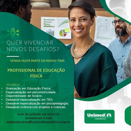 A Unimed Leopoldina está com inscrições abertas para profissional de educação física. Para se inscrever são necessários os seguintes requisitos: