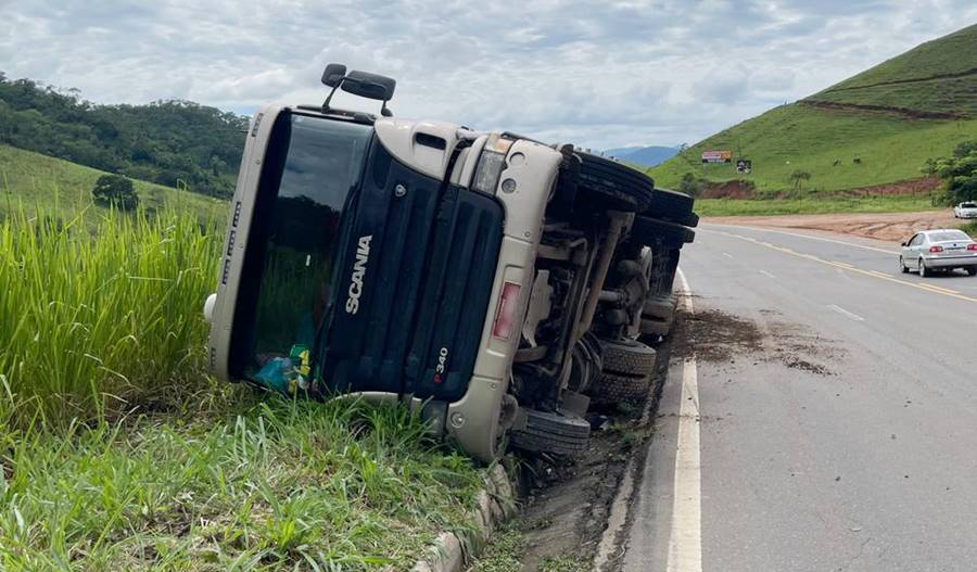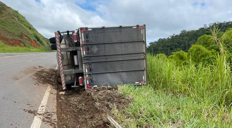 Uma carreta carregada com equipamentos utilizados para o transporte de motocicletas tombou na BR-116, no trecho próximo ao município de Além Paraíba.