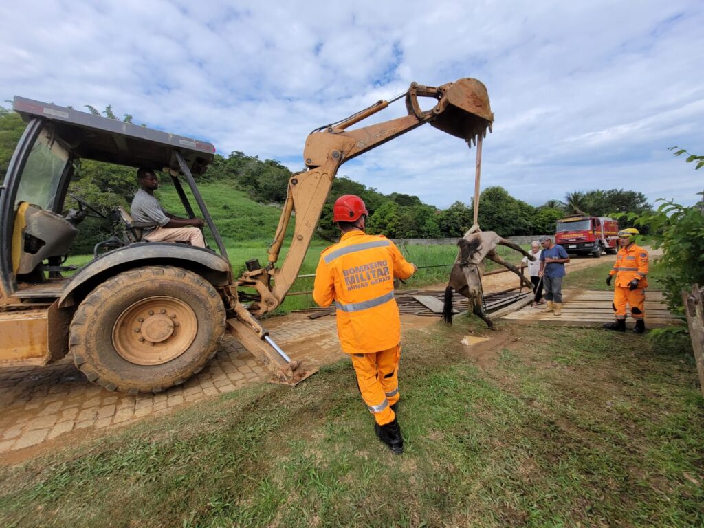 Os militares usaram técnicas apropriadas para retirar as patas do cavalo que estavam enganchadas entre a estrutura metálica. O trabalho de resgate durou 1h e contou com o apoio da Defesa Civil municipal de Leopoldina e de uma retoescavadeira.
