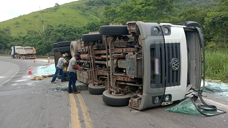 Um caminhão carregado de vidro espelhado tombou no início da manhã desta quinta-feira, 19 de janeiro, na altura do km 782, nas proximidades do Alto da Serra da Vileta, em Leopoldina.