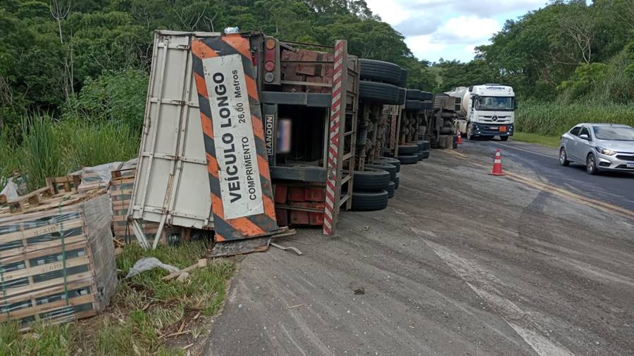 Um carreta, carregada de sucata, tombou na tarde deste domingo, 22 de janeiro, no km 782 da rodovia BR-116, nas proximidades do Alto da Serra da Vileta, em Leopoldina.