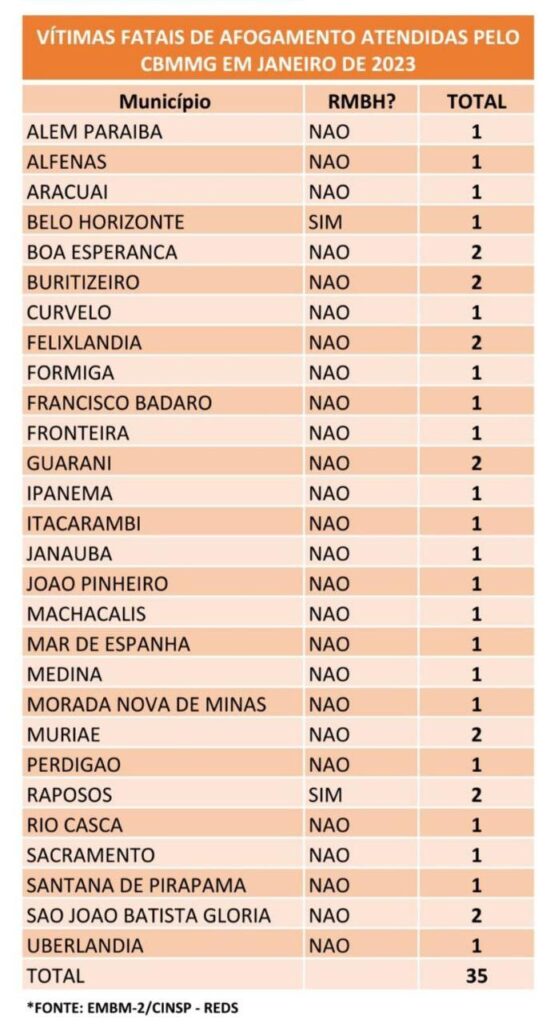 Ao menos 35 pessoas morreram em decorrência de afogamento durante esse mês de janeiro em Minas. O balanço do Corpo de Bombeiros, divulgado nesta segunda-feira (6), aponta que o número é muito maior se for considerado princípio de afogamento e casos relacionados.