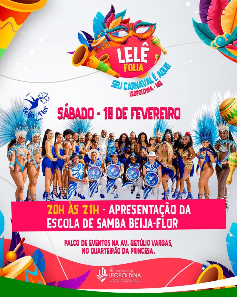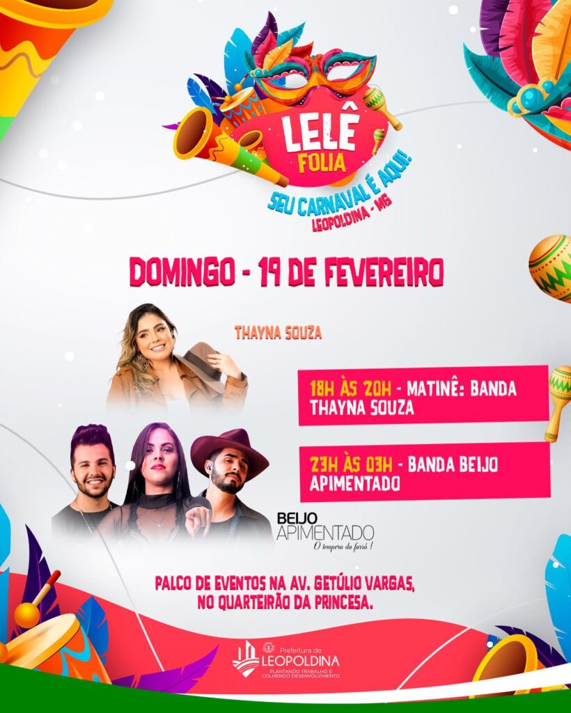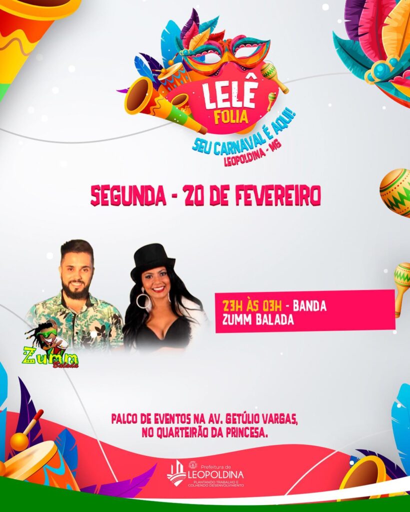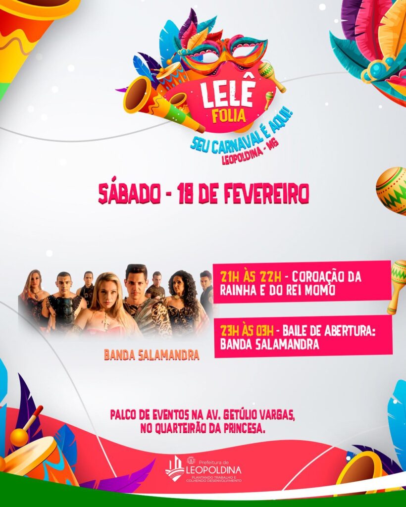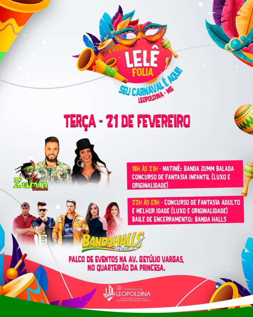 A Prefeitura de Leopoldina divulgou a programação do Carnaval 2023 (Lelê Folia), que será realizado de 18 a 21 de fevereiro na Avenida Getúlio Vargas, nas imediações do monumento à Princesa Leopoldina, onde ficará o palco de eventos.