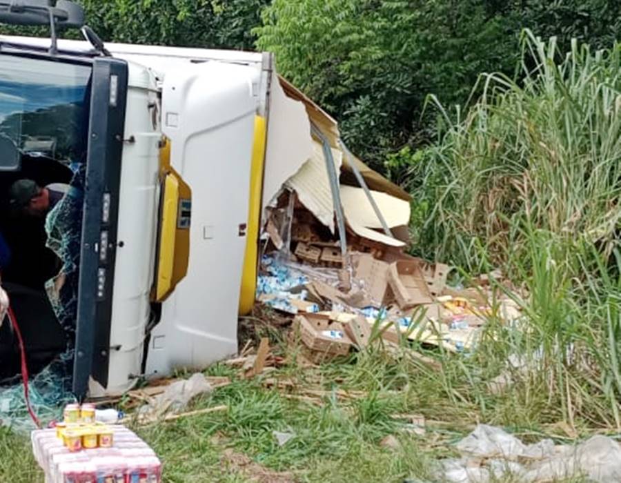 Tombamento de carreta carregada de iogurte foi registrado nesta quinta-feira na rodovia BR-116. Motorista ficou ferido.