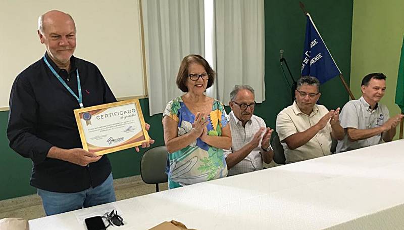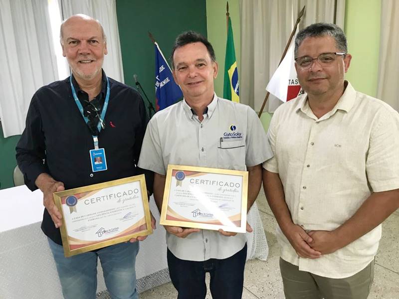 Em seguida a Provedora fez a entrega de Certificados de Gratidão da Casa de Caridade Leopoldinense à Energisa, através de seu presidente Eduardo Mantovani, em agradecimento por ter sido contemplada pela segunda vez pelo Projeto de Eficiência Energética e à Carto Solar, através do seu Técnico Responsável Diego Montes Barbosa, pela dedicação e profissionalismo na implantação das placas fotovoltaicas no Hospital através do Projeto de Eficiência Energética da Energisa, ambos Certificados assinados pela Provedora Vera Maria do Vale Pires e pelo Administrador Hospitalar Romy Farage Batista.
